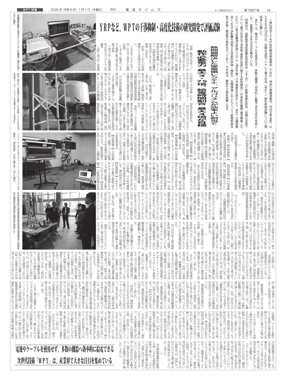 電気興業株式会社(本社:東京都江東区、代表取締役社長:近藤忠登史、以下「当社」)が代表研究機関として参画している、総務省委託研究「空間伝送型ワイヤレス電力伝送の干渉抑制・高度化技術に関する研究開発」についての記事が、2026年1月1日発刊の「電波タイムズ」に掲載されました。
