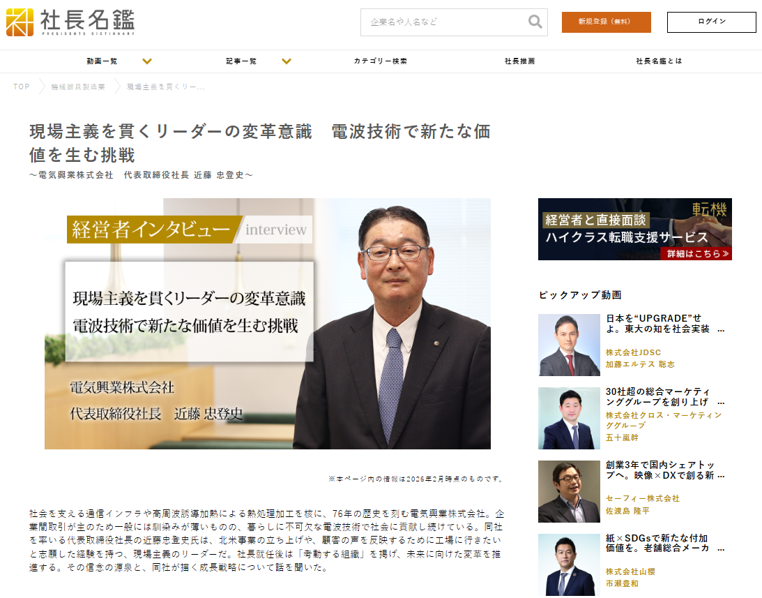 電気興業株式会社(本社:東京都江東区、代表取締役社長:近藤忠登史、以下「当社」)は、「社長名鑑」の「業界毎特集記事」にて、当社代表取締役社長 近藤忠登史のインタビュー記事が掲載されたことをお知らせします。