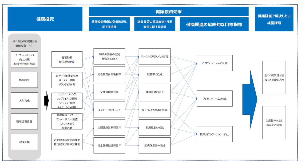 当社は健康経営を通じて、「全ての従業員が活躍できる職場づくり」と「生産性の向上と収益力の強化」という2つの経営課題を解決すべく、「アブセンティーズムの低減」「プレゼンティーズムの低減」「従業員エンゲージメントの向上」に取り組んでおります。